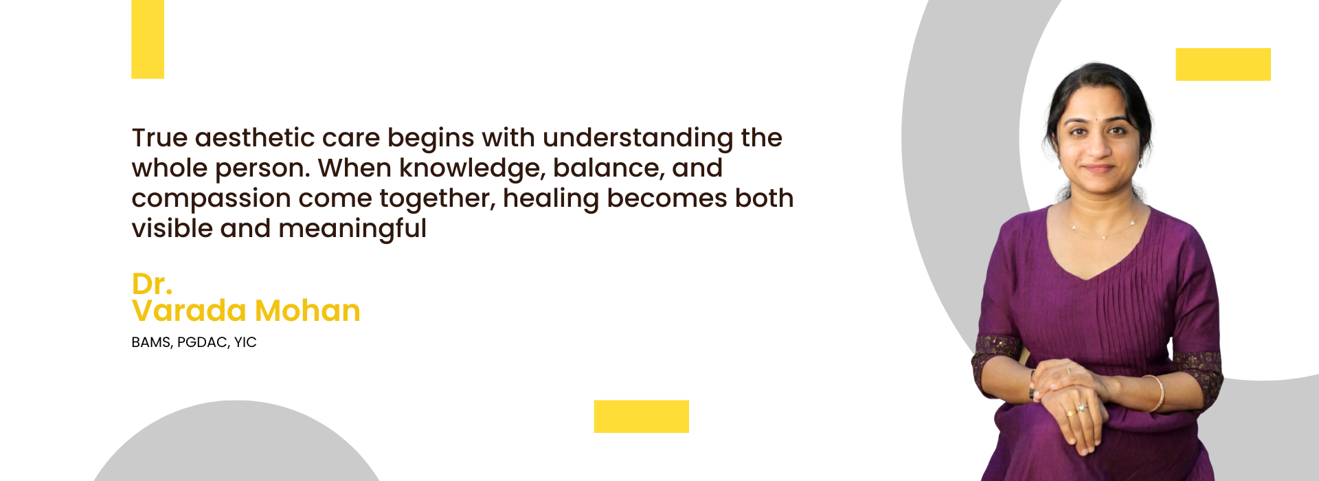 Dr. Varada Mohan (BAMS, PGDAC, YIC) is an Ayurveda physician, consulting cosmetologist, and academic leader specializing in integrative skin and wellness care. With a strong foundation in classical Ayurvedic principles, complemented by advanced training in cosmetology and yoga sciences, she adopts a structured and evidence-aligned approach to skin health.